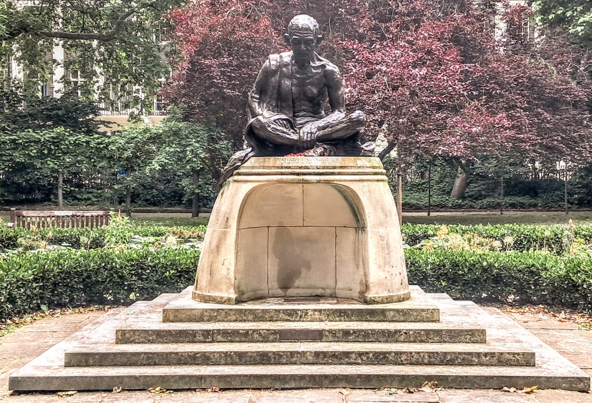 The centre-piece of the gardens in Tavistock Square is the sculpture of Mahatma Gandhi (1869-1948) by the Polish-born sculptor Fredda Brilliant (1903-1999). It was unveiled by the then Prime Minister Harold Wilson in May 1968. The hollow pedestal is used, as intended, by people leaving e floral tributes to the peace campaigner who led the nonviolent resistance to oppression in South Africa and colonial rule in India.